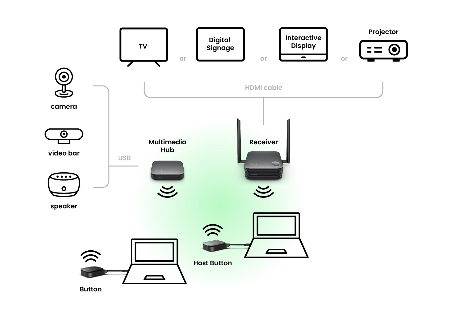 Brak skomplikowanej konfiguracji sieci ani pomocy IT. Odbiornik, multimediowy hub i przycisk łączą się automatycznie - podłącz i prezentuj od razu.