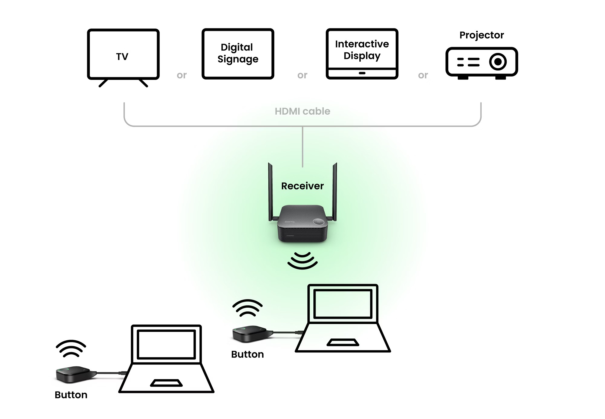 Brak skomplikowanej konfiguracji sieci ani pomocy IT. Odbiornik, multimediowy hub i przycisk łączą się automatycznie - podłącz i prezentuj od razu.