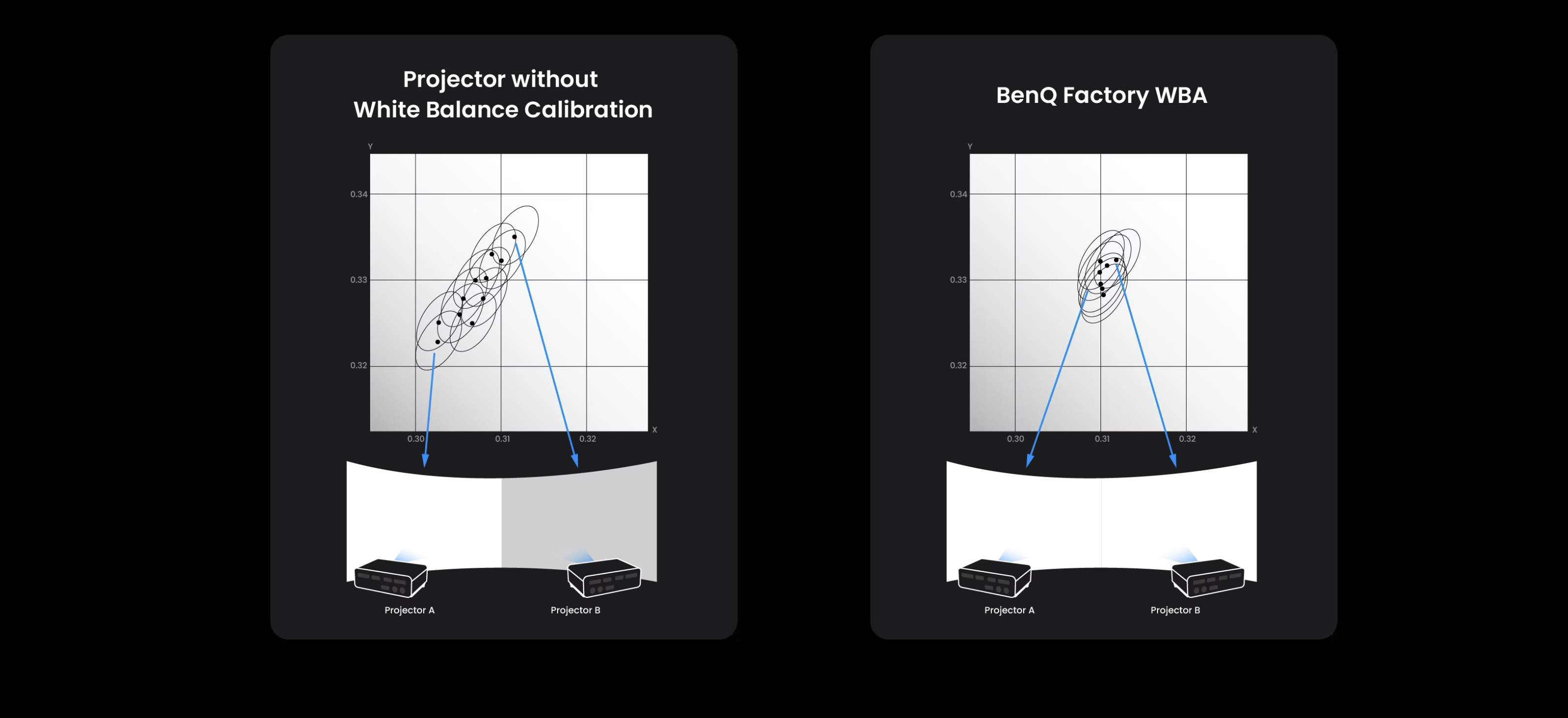 Fabryczna regulacja balansu bieli BenQ (WBA) redukuje różnice pomiędzy obrazami pochodzącymi z różnych projektorów, znacząco ograniczając konieczność ręcznej kalibracji. Pozwala zaoszczędzić nawet cały dzień pracy podczas dużych instalacji, jednocześnie zapewniając spójne wyrównanie obrazu w projekcji łączonej.