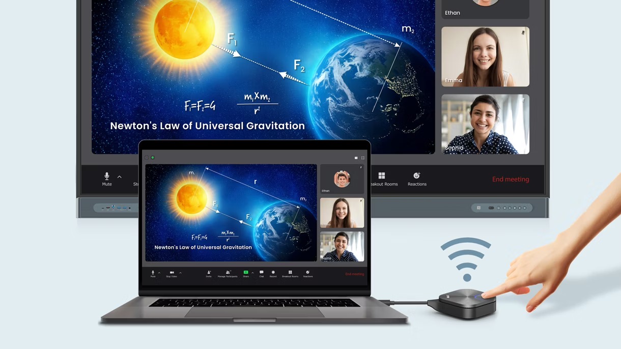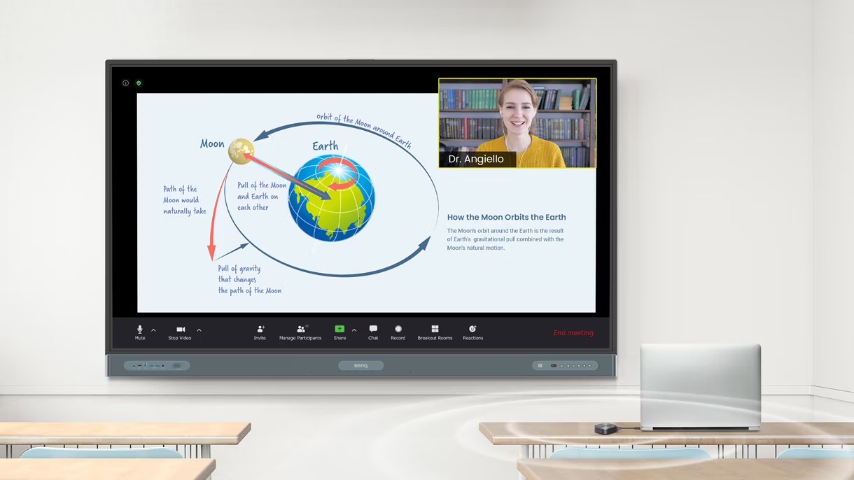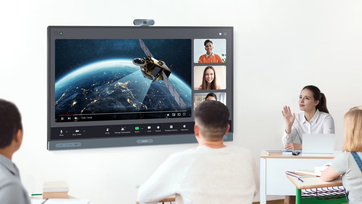 Przenieś rozmowy wideo na wyższy poziom dzięki BenQ Board. Wystarczy podłączyć InstaShare Button do laptopa, przesłać ekran i zacząć cieszyć się lepszą jakością dźwięku i obrazu, a także dodatkowymi interaktywnymi funkcjami.