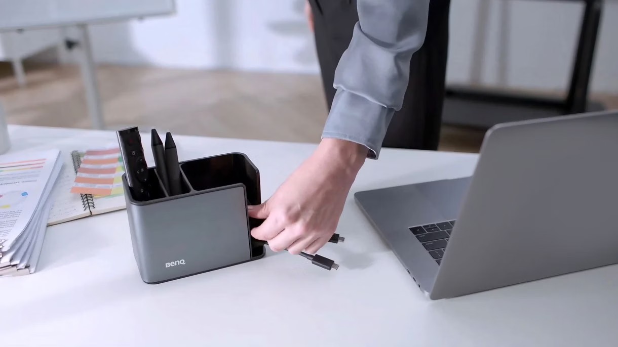 Utrzymaj porządek na biurku dzięki stacji dokującej InstaShare. Przechowuj wszystkie akcesoria BenQ — w tym przyciski InstaShare, długopisy i piloty — w jednym miejscu.