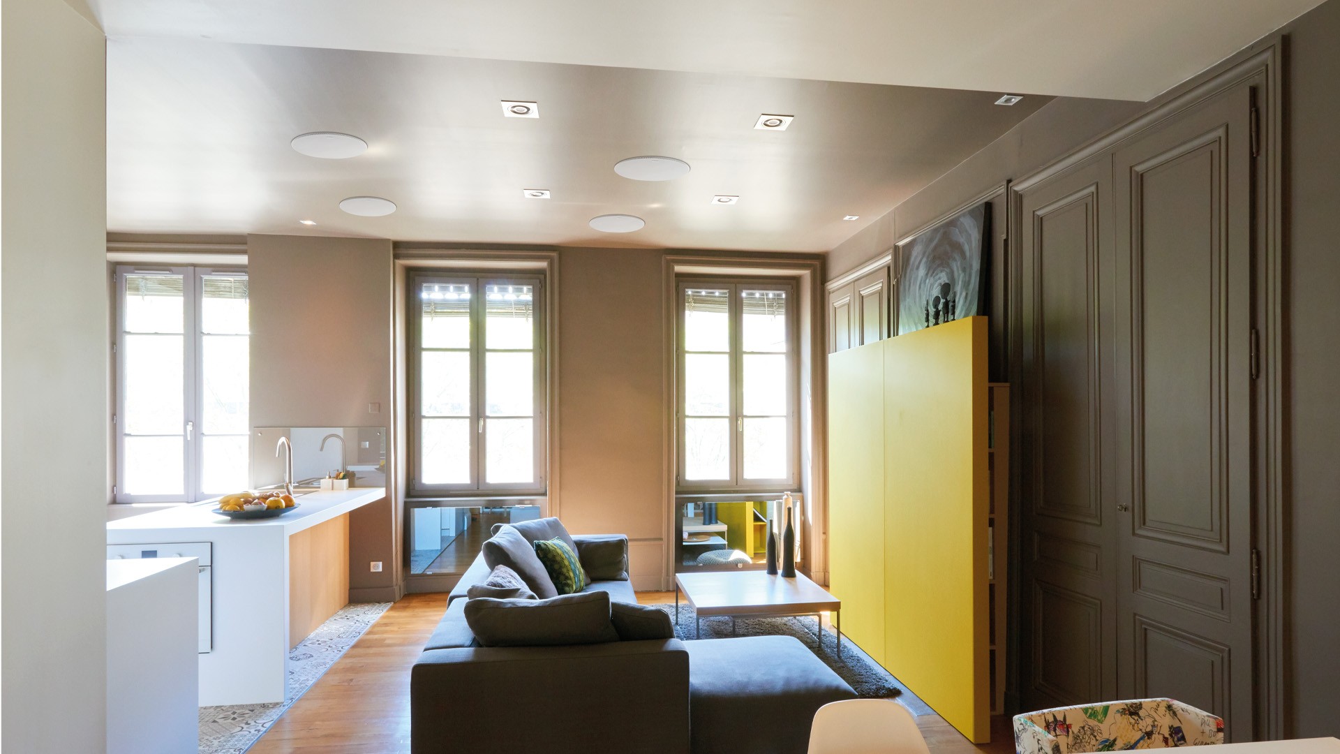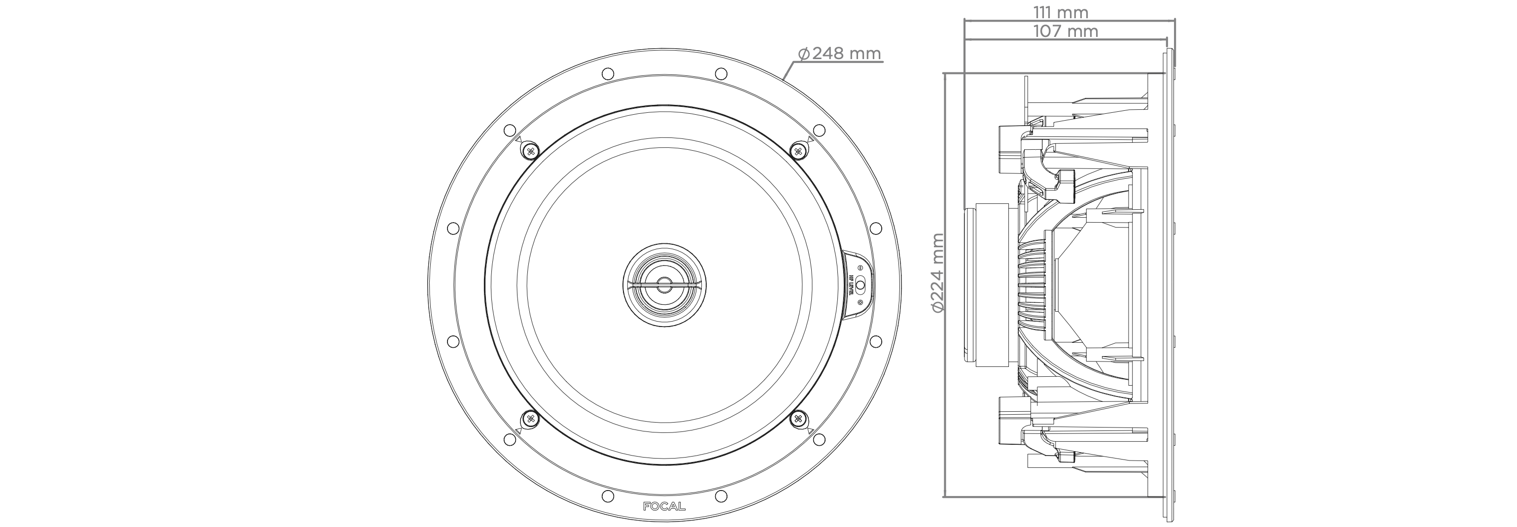 Dzięki niewielkiej głębokości zabudowy, głośnik można szybko i łatwo zamontować w ścianie lub suficie. Gotowe do malowania maskownice magnetyczne, okrągłe lub kwadratowe, zapewniają dyskretną, estetyczną integrację z otoczeniem.