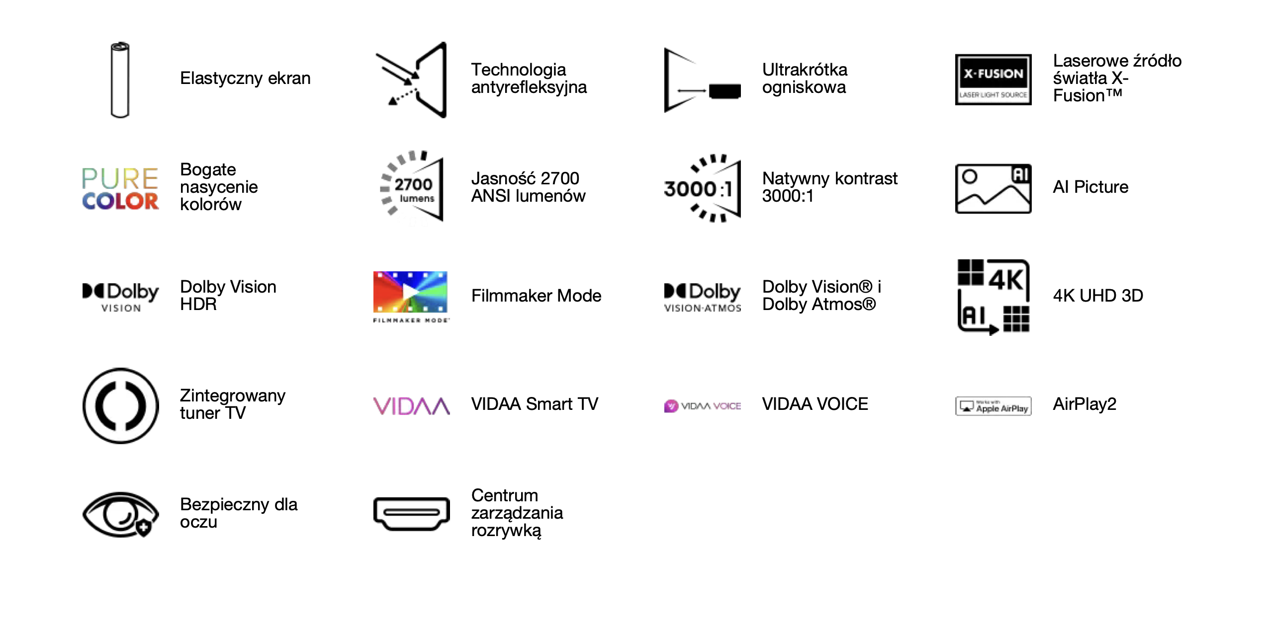 Zaawansowana technologia Laser TV o ultrakrótkiej ogniskowej pozwala wyświetlać ogromny obraz z niewielkiej odległości, zachowując najwyższą rozdzielczość i ostrość.