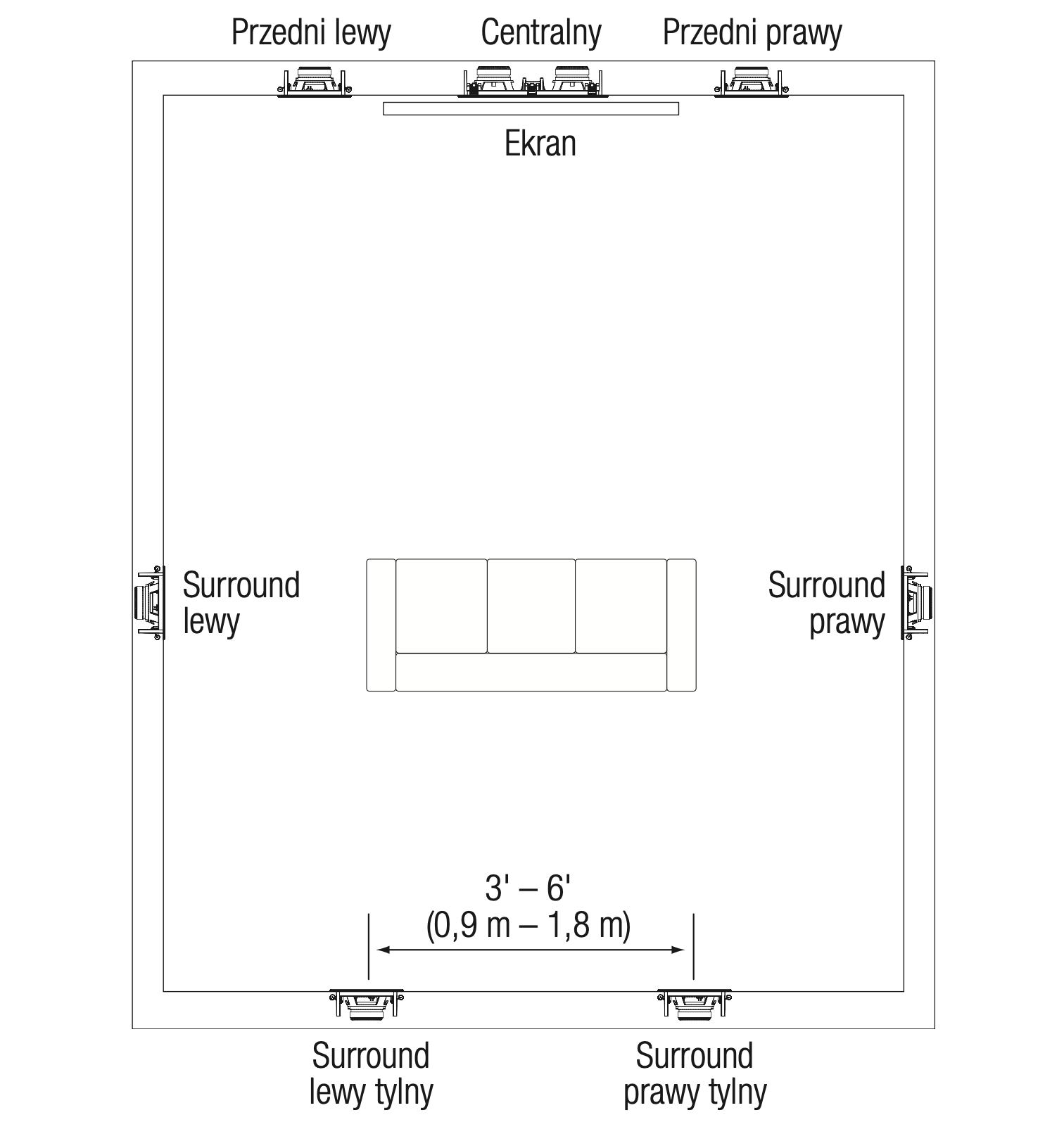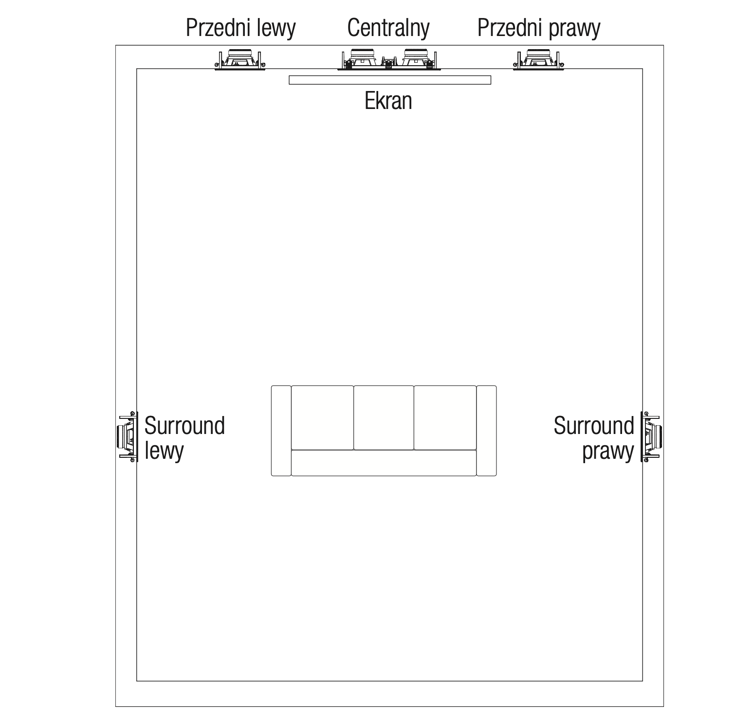 Aby uzyskać właściwą scenę dźwiękową, głośniki należy rozmieścić możliwie równomiernie, tak aby dźwięk wypełniał całe pomieszczenie w sposób jednolity.
