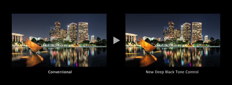 Nowy system Deep Black Tone Control został dodany do funkcji Frame Adapt HDR. Dzięki ulepszonemu algorytmowi jeszcze precyzyjniej kontroluje on tony w ciemnych partiach obrazu, aby uzyskać bardziej naturalną głębię czerni.