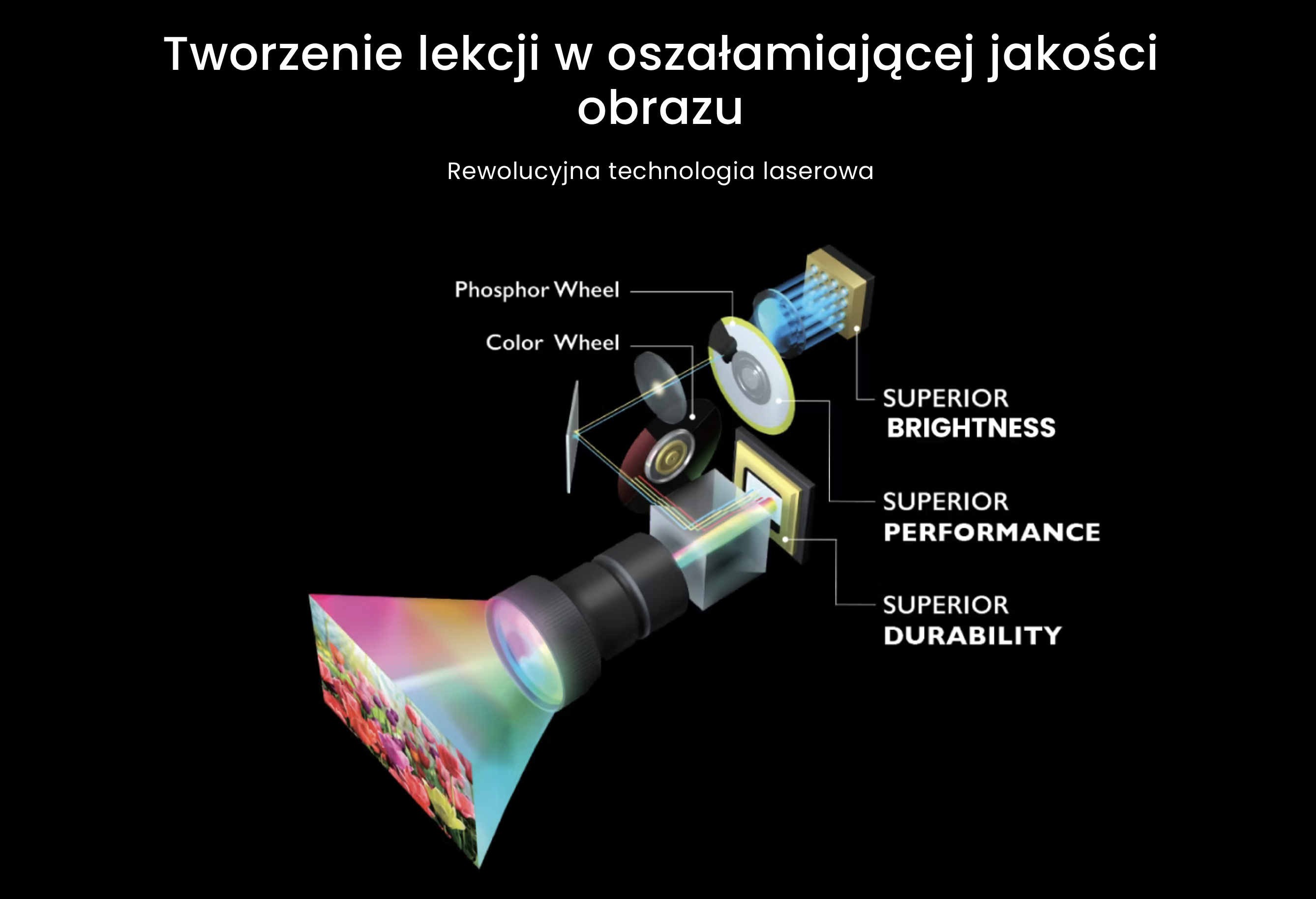 Zaawansowane laserowe źródło światła zapewnia doskonałą jasność, stabilność kolorów oraz długą żywotność. Precyzyjnie dostrojony laser o wysokiej mocy w połączeniu z dodatkowym kołem kolorów z filtrem żółtym zwiększa efektywność świetlną i poprawia odwzorowanie barw.
