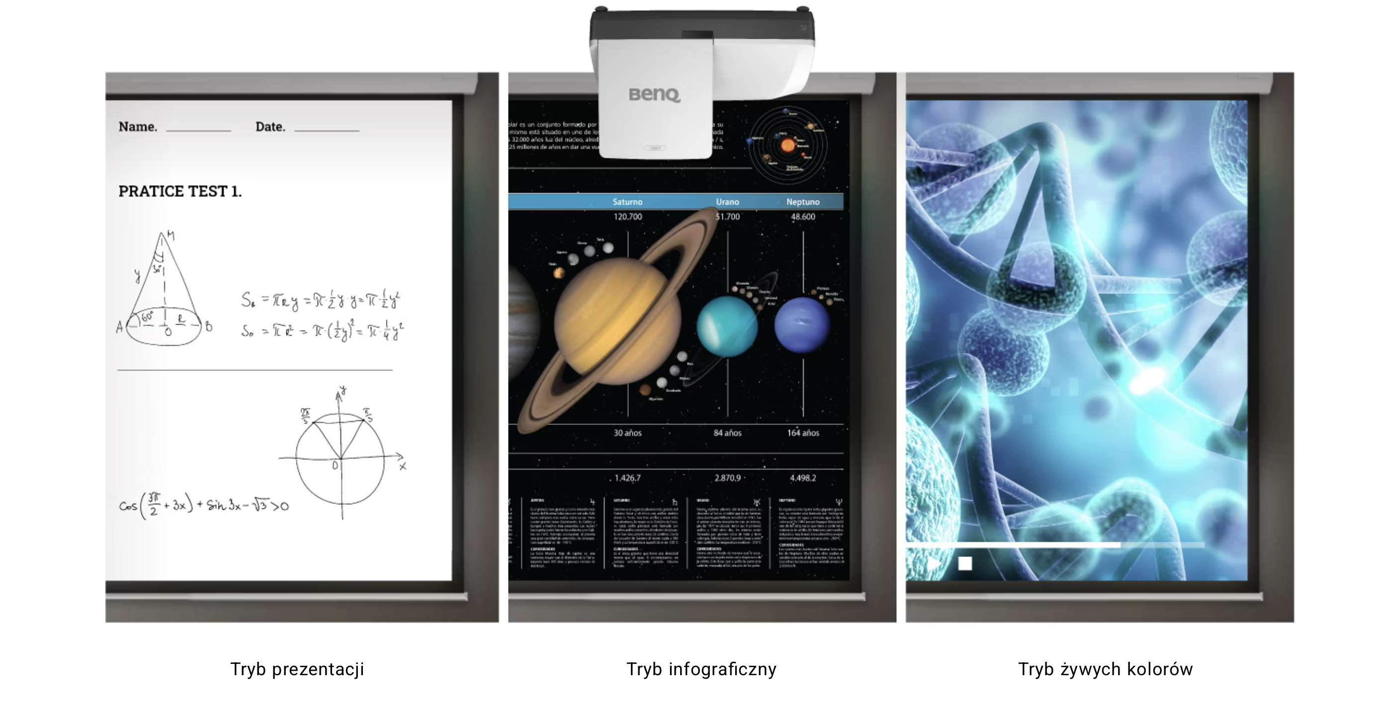 Dzięki zaawansowanej technologii korekcji barw, projektor oferuje tryby idealnie dopasowane do treści dydaktycznych: