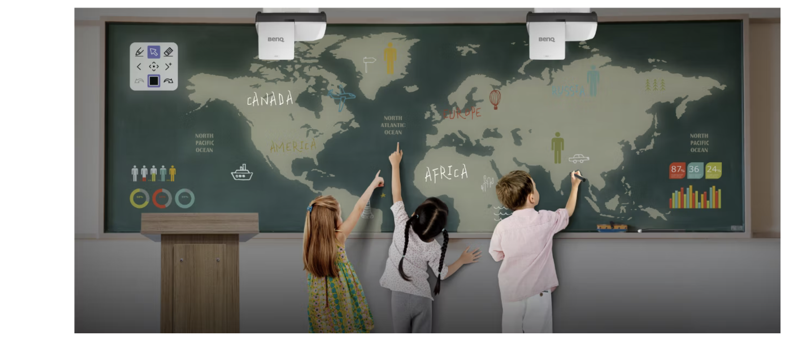 projektor obsługuje wielodotyk, pracę rysikiem oraz współpracę wieloekranową. Nauczyciele i uczniowie mogą jednocześnie pisać, rysować i notować na dwóch ekranach.