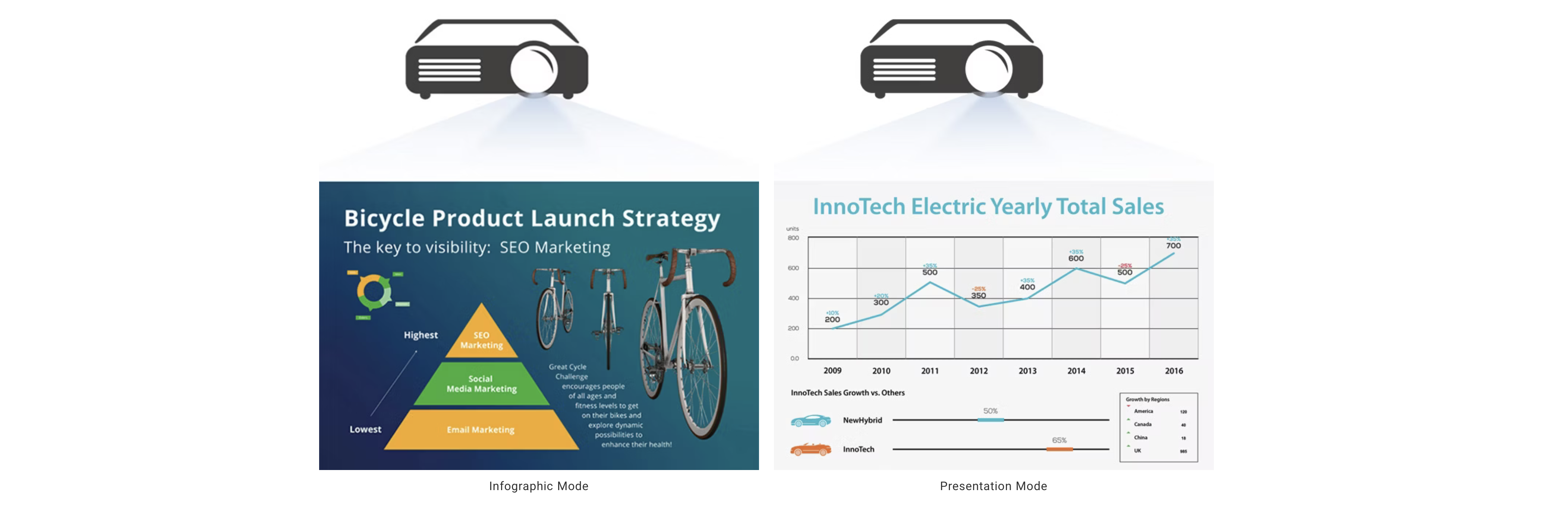 Tryb BenQ Infographic doskonale pasuje do obecnego trendu korporacyjnego, który polega na opanowaniu prezentacji z dużą ilością infografik, do czego dążą wszystkie nowoczesne przedsiębiorstwa. Tryb Infograficzny jest doskonały do pokazania tekstu i grafiki infografiki w szczegółach, dzięki wysokiej jasności LU785 i lepszej gradacji kolorów poprzez 96% pokrycie Rec.709 kolorów, zapewniając bardziej nasycone i żywe kolory niż w trybie prezentacji. Dodatkowo, tryb Vivid Mode (Żywe kolory) został zaprojektowany dla uzyskania najwyższej jakości kolorów podczas prezentacji wideo lub obrazów.