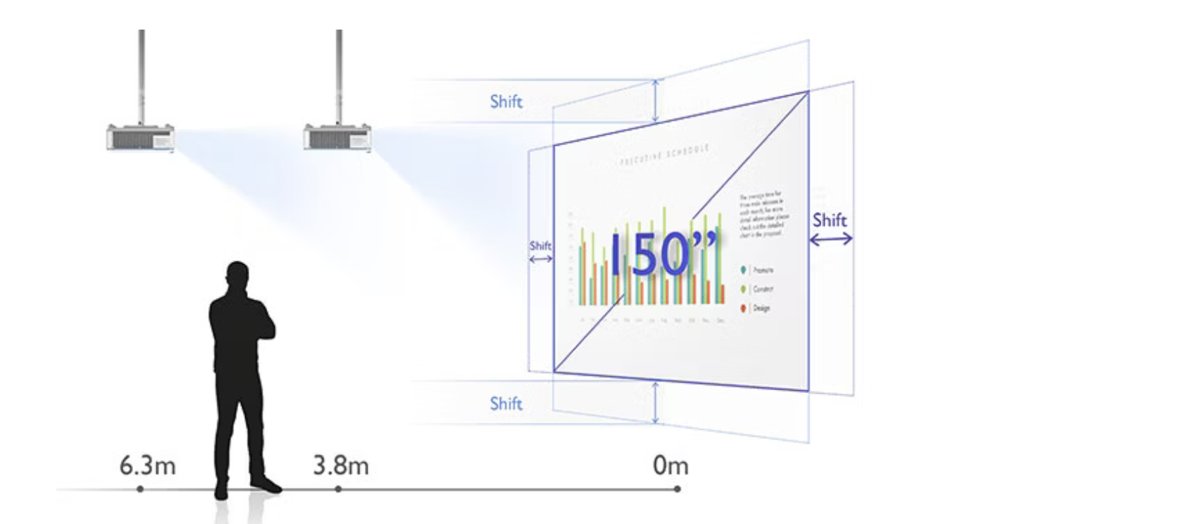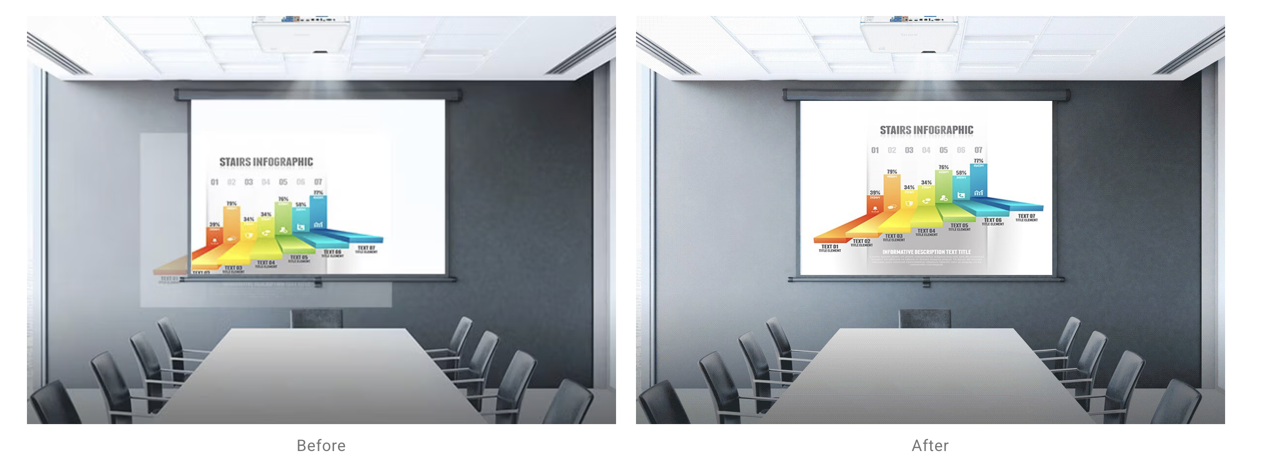 LU785 z 1,65X dużym zoomem i systemem lens shift może idealnie wyrównać obraz w każdym trudnym miejscu, zwłaszcza gdy światła lub otwory wentylacyjne znajdują się w miejscu montażu na suficie. Elastyczność instalacji ułatwia firmom wymianę przestarzałych projektorów i oferuje różnorodne opcje montażu w różnych zastosowaniach w salach konferencyjnych.