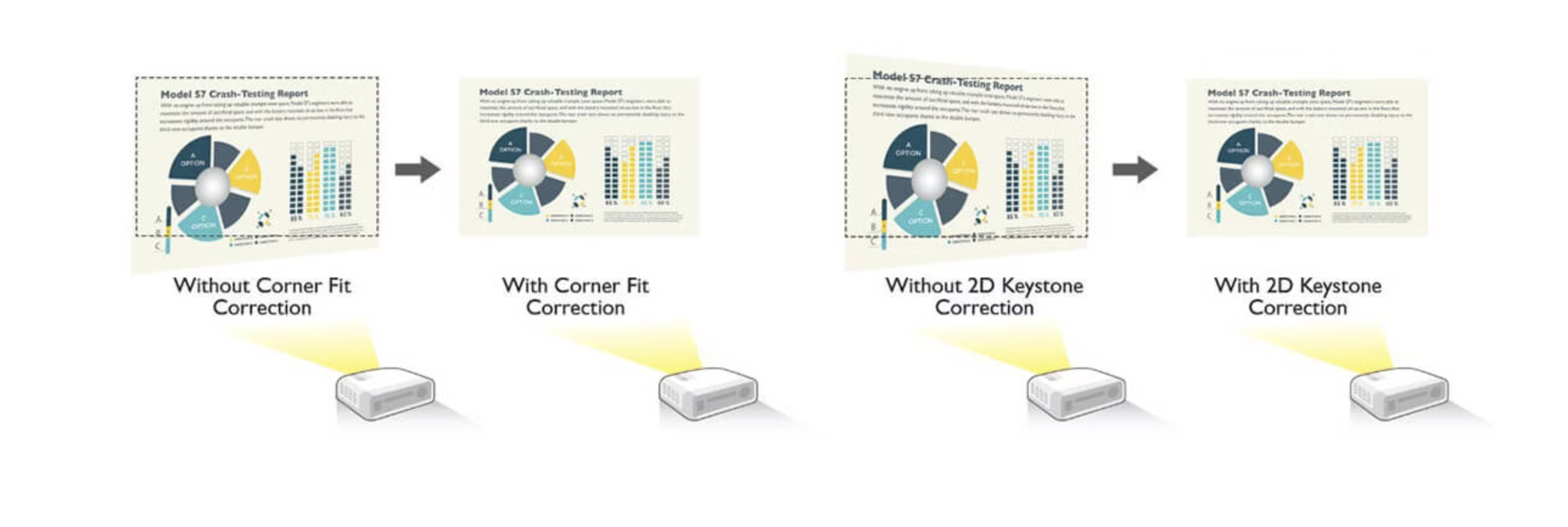 Projektor LU785 jest wyposażony w dwuwymiarowy zakres korekcji geometrii obrazu ±30° zarówno na osiach poziomych, jak i pionowych służący do przeciwdziałania efektowi trapezu, co jest częstym zjawiskiem w przypadku instalacji projektora poza główną osią. Instalatorzy mogą skorzystać z funkcji dopasowania narożników, aby odpowiednio dopasować każdy narożnik do idealnie wyrównanej geometrii obrazu.