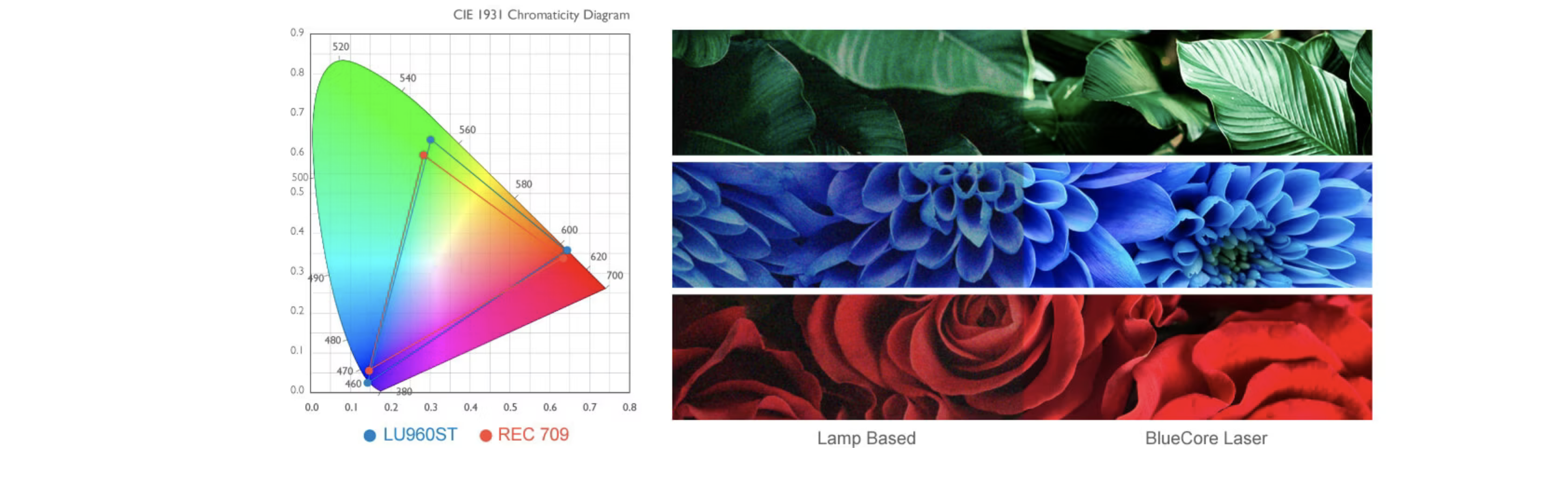 Potężna projekcja laserowa LU960 wykorzystuje system podwójnego koła kolorów, aby zapewnić niezrównaną wydajność kolorów, która osiąga 96% pokrycia kolorów Rec.709. Zwiększając współczynniki kolorów i czystość kolorów RGBY, LU960 radykalnie zwiększa nasycenie kolorów, aby zapewnić doskonałą jakość prezentacji.