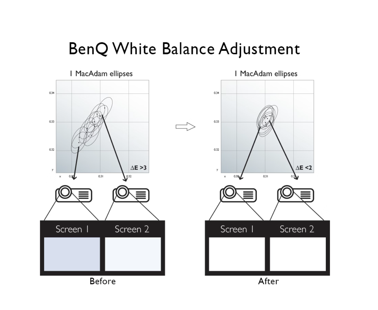 Ekskluzywne regulacje balansu bieli BenQ mogą zredukować zmienne balansu bieli pomiędzy obrazami wyświetlanymi z różnych projektorów do tak niskiego poziomu, że większość ludzi nie widzi żadnej różnicy. Pozwala to uzyskać płynną i dokładną jakość obrazu bez zakłócających rozbieżności.