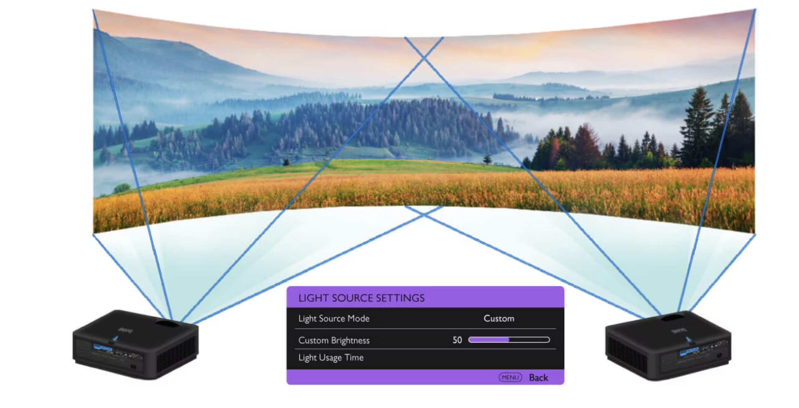 Tryb niestandardowego oświetlenia moduluje moc światła od 25% do 100% z szybkością 1%, optymalizując wyświetlany obraz w różnych warunkach oświetlenia otoczenia. Jest to szczególnie przydatne do łączenia stałej jasności w wielu projekcjach.