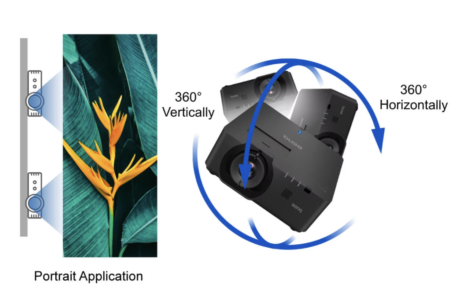 Technologia laserowa gwarantuje niezawodną projekcję pod dowolnym kątem. Opcje dynamicznej instalacji, takie jak obrót o 360° i aplikacje portretowe, umożliwiają projekcję na suficie, ścianach, podłogach lub oznakowaniach pod kątem.