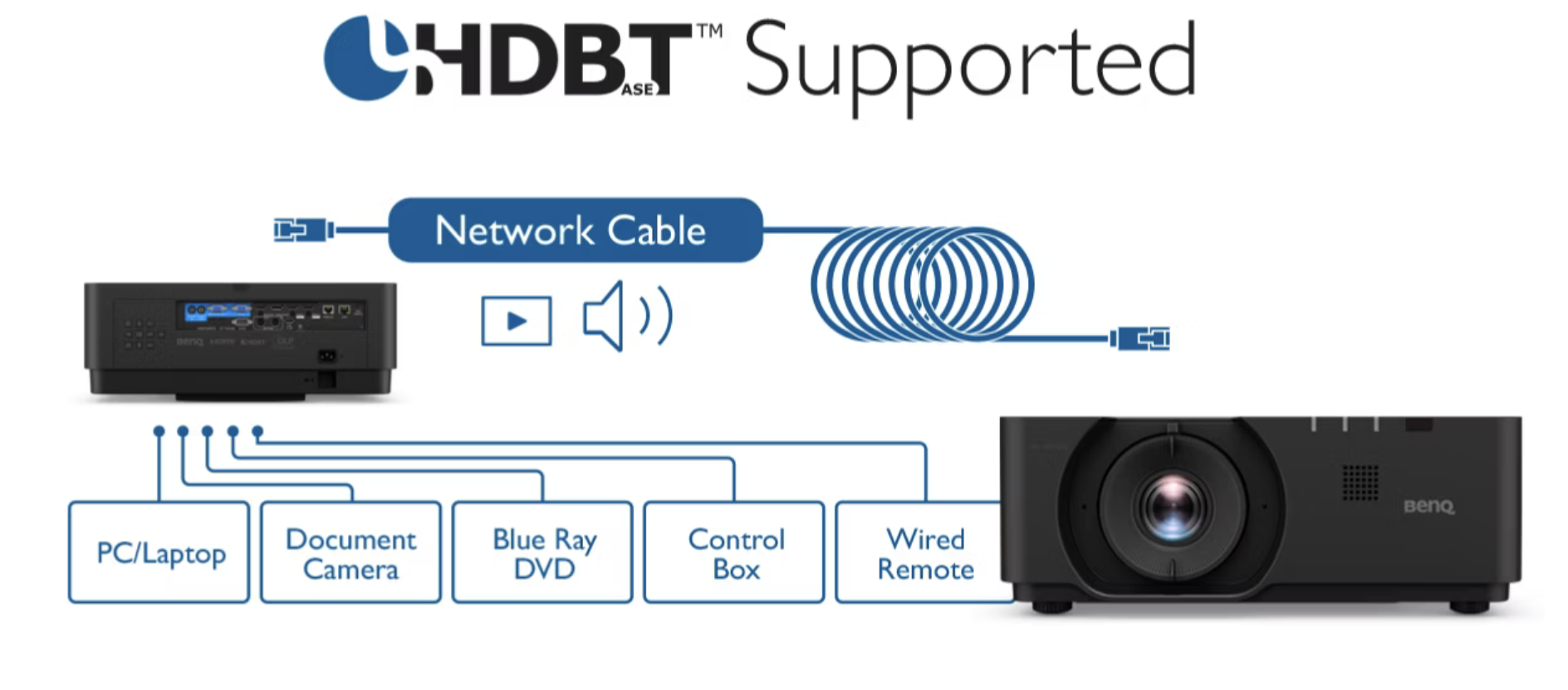 Przełomowa łączność HDBaseT łączy sygnały sterujące sygnałem wideo, audio, RS-232 i LAN z wielu źródeł, w tym: komputerów stacjonarnych, laptopów, kamer dokumentacyjnych, Blu-ray i DVD, na jednym kablu RJ-45. Zapewnia to płynną transmisję na odległość do 100 metrów.
