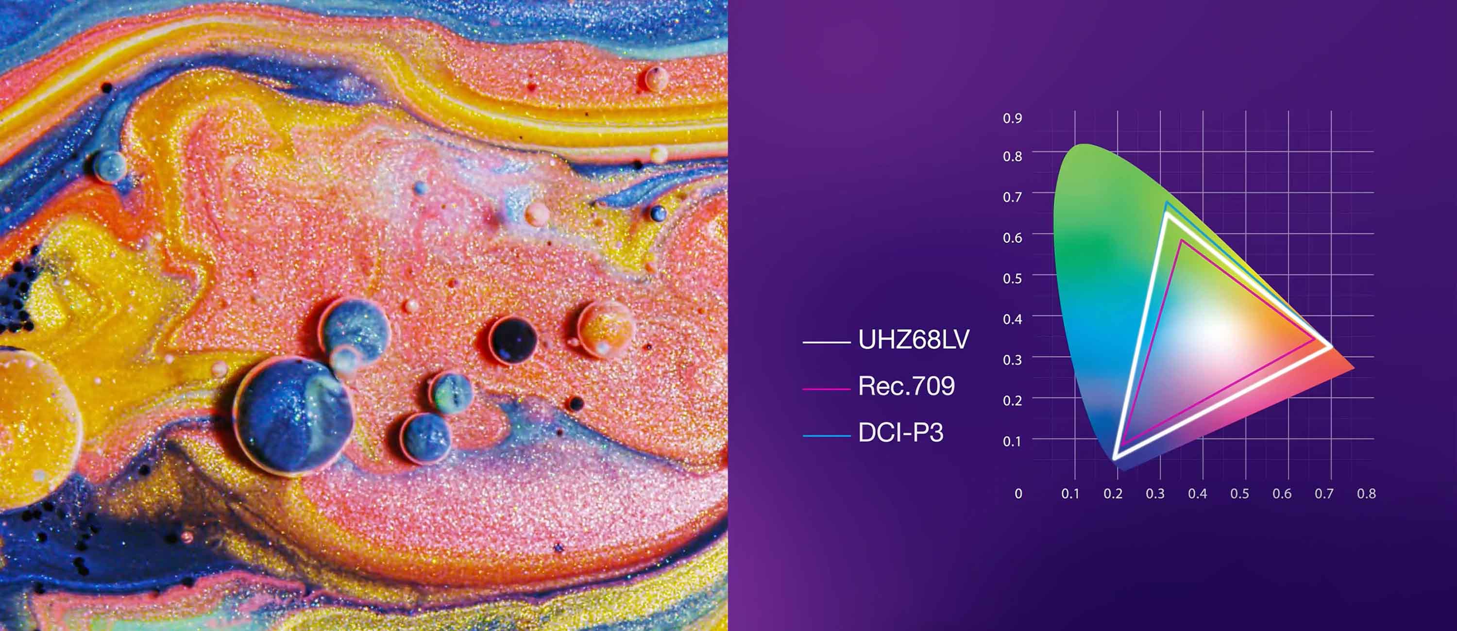 Projektor UHZ68LV oferuje 100% pokrycia przestrzeni barw Rec.709 oraz tryb szerokiej palety kolorów z 95% DCI-P3, zapewniając niezwykle wierne i naturalne odwzorowanie barw. Niezależnie od tego, czy oglądasz filmy, czy grasz w gry, obraz zachwyca intensywnymi kolorami, głębszą czernią oraz wysoką precyzją barw.