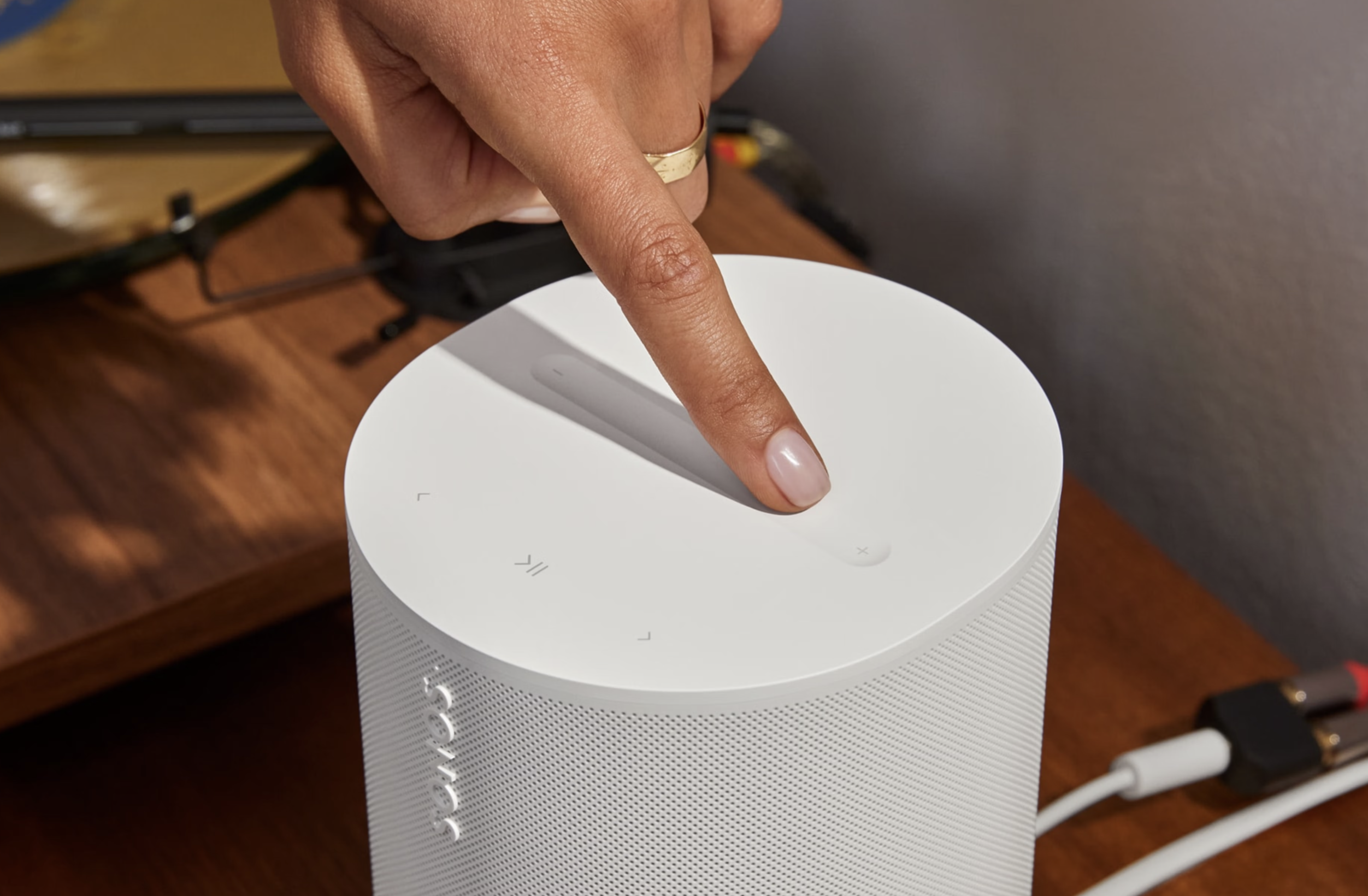 Pojemnościowe przyciski dotykowe na obudowie umożliwiają odtwarzanie i zatrzymywanie muzyki, pomijanie oraz ponowne odtwarzanie utworów, regulację głośności, a także grupowanie i rozdzielanie głośników w systemie Sonos.