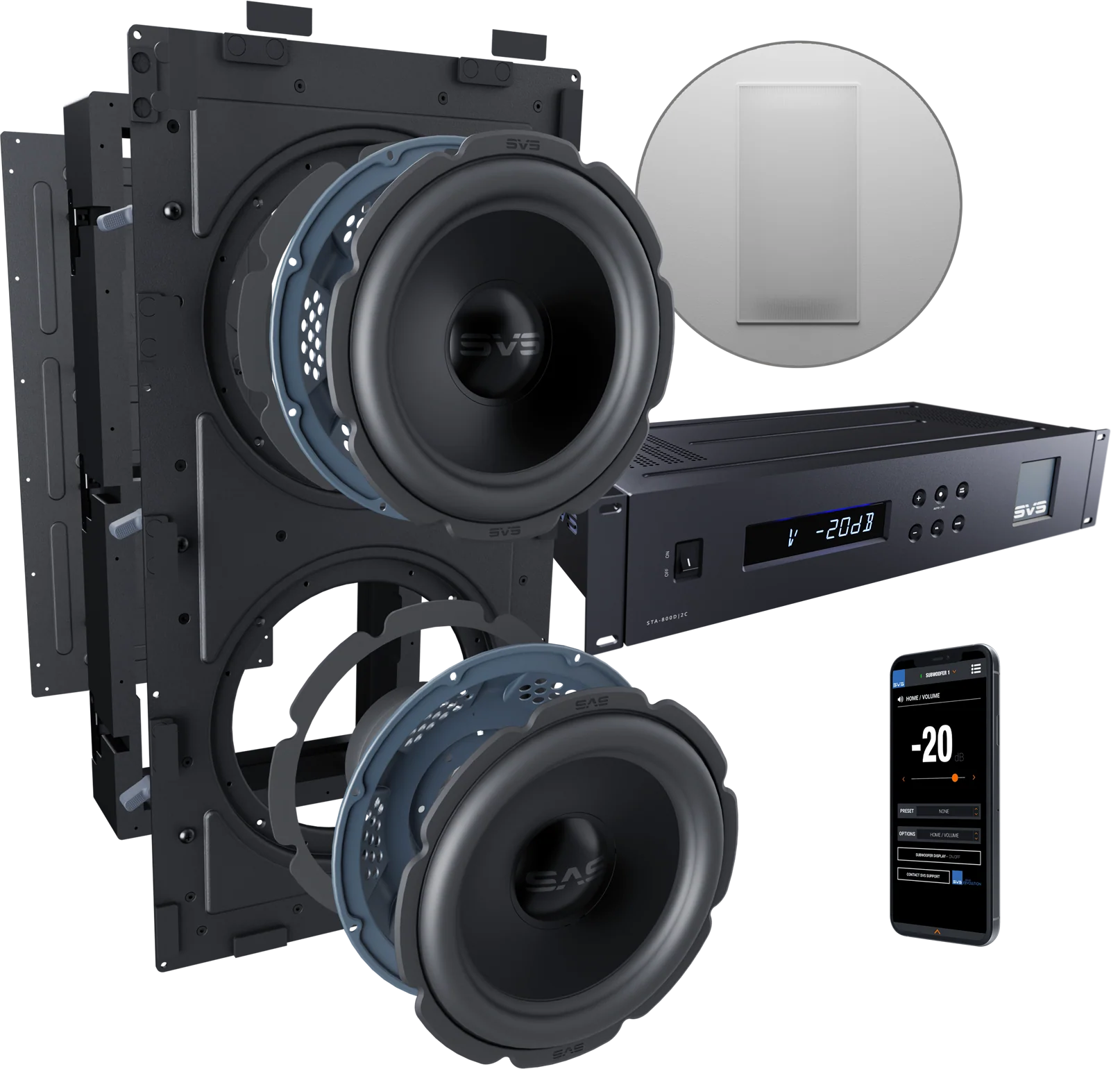Platforma wzmacniacza zastosowana w SVS 3000 In-Wall przenosi flagowe technologie SVS do świata instalacji ściennych. Łączy wysokoprądowe wyjście dyskretnych tranzystorów MOSFET z efektywnością klasy D oraz potężną mocą obliczeniową procesora DSP Analog Devices 50 MHz.