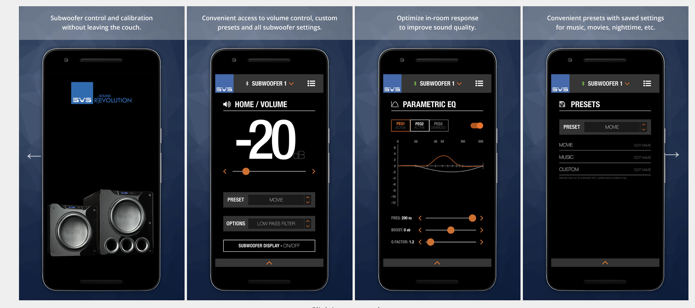 Dedykowana aplikacja SVS pozwala na pełną kontrolę subwoofera z poziomu smartfona: