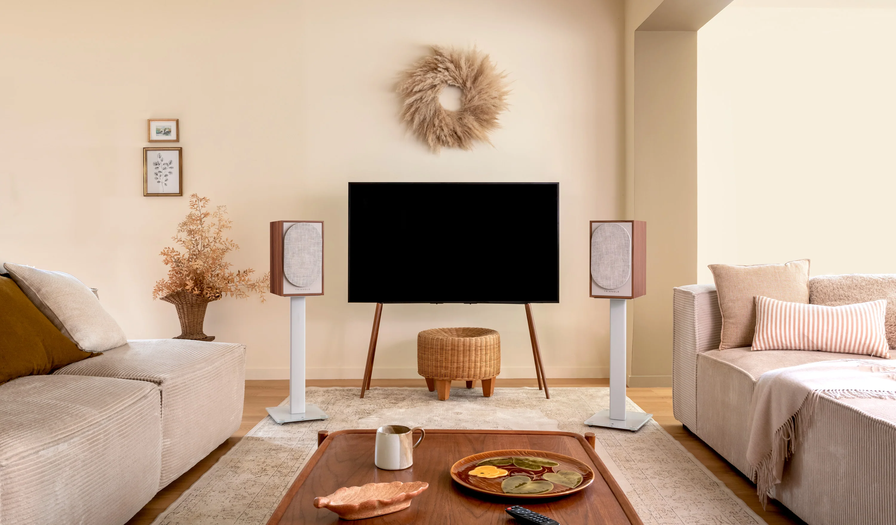 System „all-in-one” gotowy do odsłuchu. Kolumna „Master” zawiera wzmacniacz i wszystkie wejścia, a sygnał do drugiej kolumny przesyłany jest dołączonym 3-metrowym przewodem głośnikowym. W razie potrzeby można zastosować własny kabel głośnikowy, aby dopasować odległość między kolumnami.