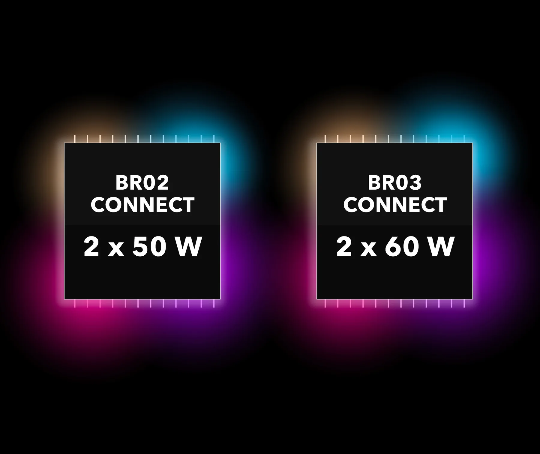 Zestaw BR03 CONNECT zawiera dedykowany 3-metrowy przewód łączący obie kolumny. Dołączony pilot radiowy (RF) o zasięgu do 15 metrów umożliwia wygodne sterowanie systemem z dowolnego miejsca w pomieszczeniu.