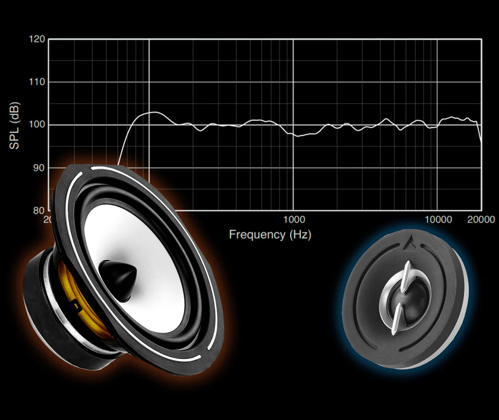 Wzmacniacz 2 × 60 W Class D, połączony z 16-centymetrowym przetwornikiem z naturalnej celulozy oraz 25-mm jedwabną kopułką, zapewnia perfekcyjnie kontrolowaną, liniową charakterystykę brzmienia.